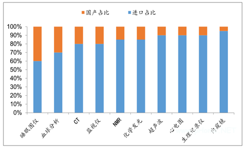中国医疗器械市场高速发展,但是中国本土医疗器械企业因为技术、品牌等与国际医疗器械巨头还有较大差距,国内企业在中、低端市场占据我国医疗器械行业市场份额比例最大。化学发光、内窥镜、CT、高档监视仪、NMR、超声波、心电图等市场则是国外企业占优,进口产品占有率超过8成。
