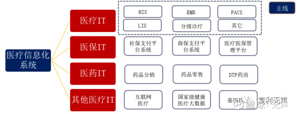 医院是医疗信息化的主要对象,围绕医院信息化构建的医疗IT系统,医保IT系统和医药IT系统是医疗信息化的主要环节。