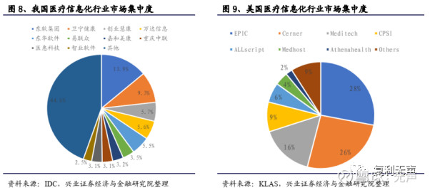 根据IDC数据,2017年我国医疗信息化行业市场份额前三甲为东软集团、卫宁健康、创业慧康,分别占据13.9%、9.3%、5.7%的市场份额,共计28.9%,显示出较低的市场集中度。相比之下,美国医疗信息化市场集中度较高。