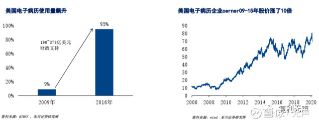根据美国的发展经验显示,2009~2016年间,美国推出HITECH等四大法案促进电子病历渗透率水平,投入超百亿美元,美国电子病历使用率从9%上升到95%以上,电子病历实现从2级向5级(美国标准)的三级跳,为美国带来了医疗信息化的黄金发展期。