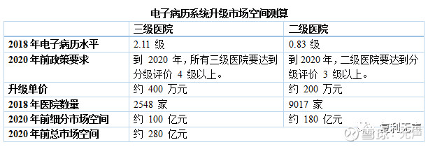2018年国内三级医院电子病历平均水平为2.11级,二级医院电子病历平均水平为0.83级,据测算,2020年如果所有三级医院达到分级评价4级、所有二级医院达到分级评价3级将释放约300亿市场,将成为业内公司的短期业绩保障。