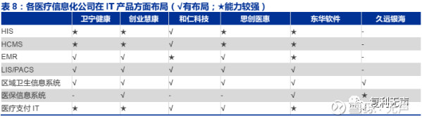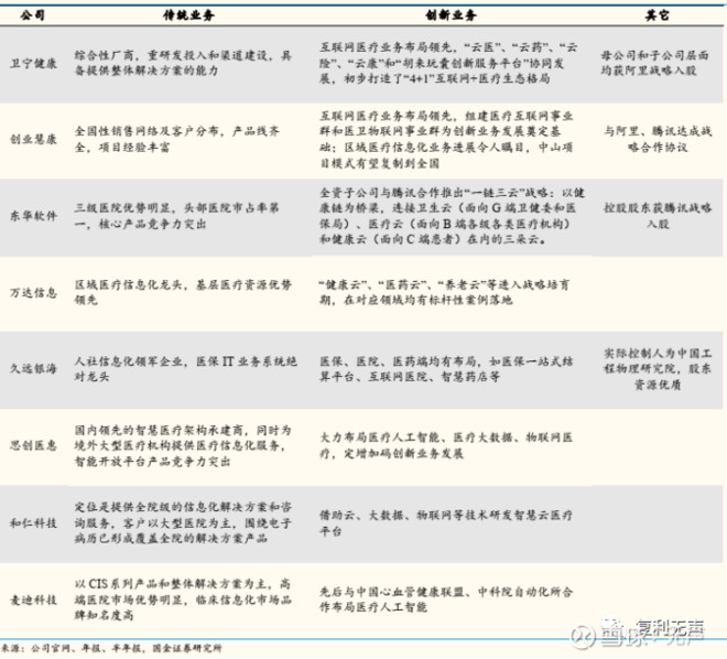 其中,卫宁健康在传统医院信息化、互联网医院方面布局较多,创业慧康在区域卫生信息化、医疗大数据领域较为出众,久远银海在医保信息系统领域有深入布局。