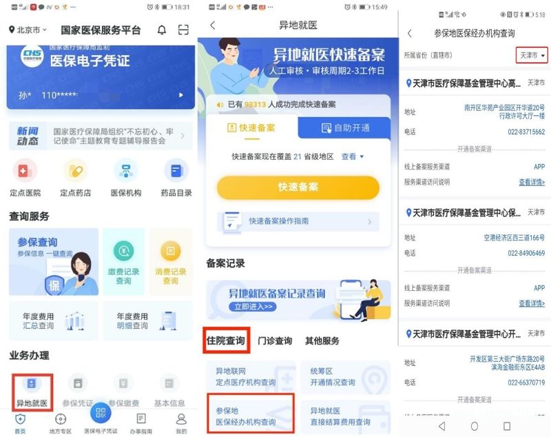 路径3:在主流应用商店下载并打开“国家医保服务平台”APP,点击“业务办理”中的“异地就医”-“住院查询”-“参保地医保经办机构查询”功能版块,了解所在参保地提供的线上备案渠道。
